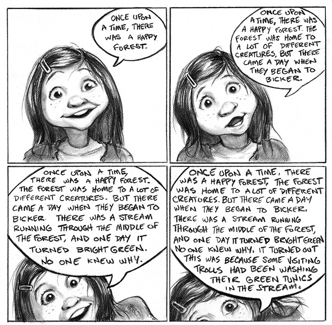 I talked to Scoble the illustrator elf about the sort of illustration that would be perfect for a tip about paragraphs.  We each suggested ideas and then imagined a young girl who talked so fast and continuously—never even stopping to breathe—that her words would feel like an avalanche with no end.