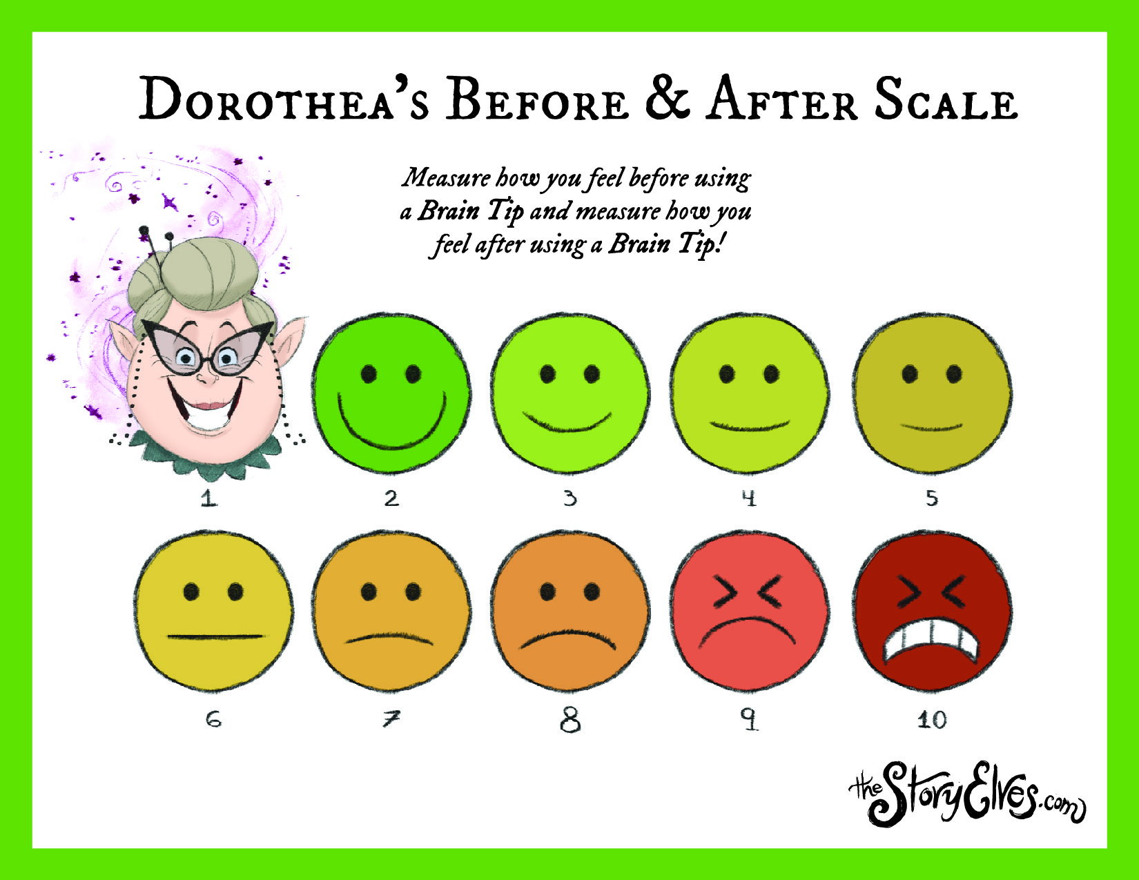 One day, after a particularly soppy spill (she had not yet taken a single sip), Dorothea invented a Brain Tip Scale for herself, to measure how she feels before using a brain tip, and how she feels after using a brain tip.  It is a clever idea to know how you feel before and after, so you know whether something is helping.