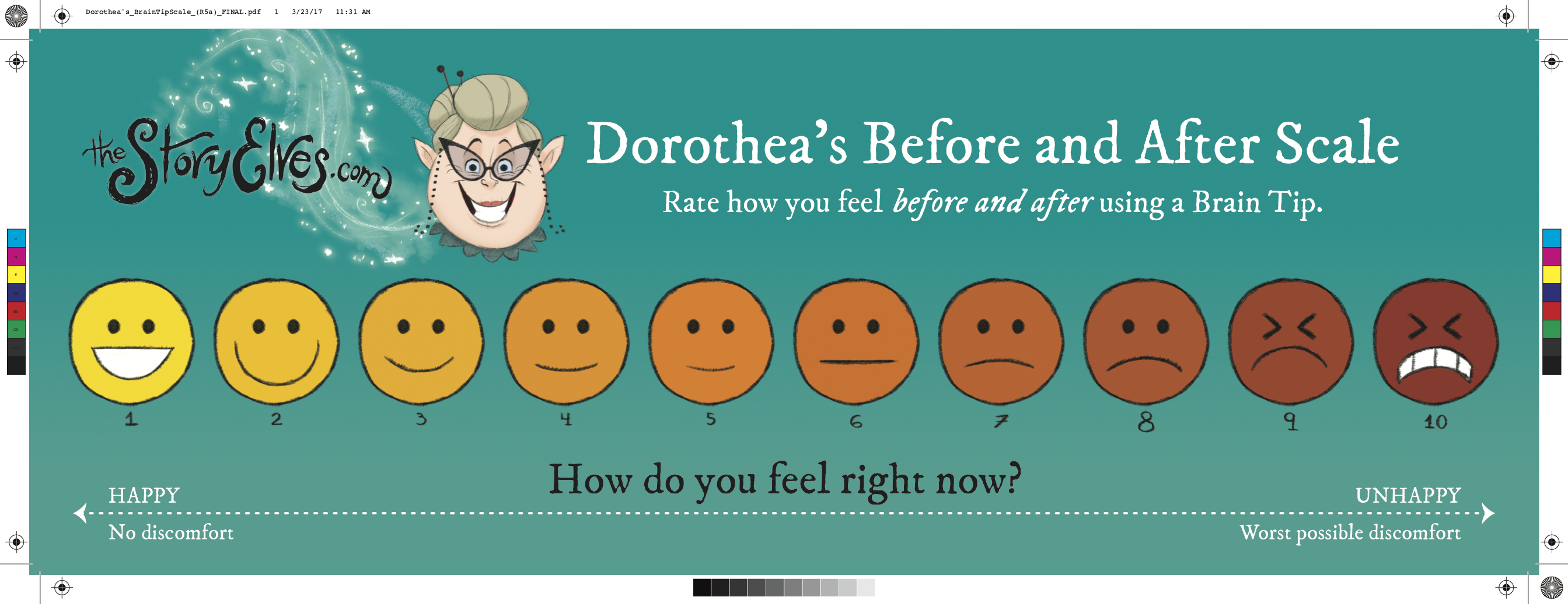 One day, after a particularly soppy spill (she had not yet taken a single sip), Dorothea invented a Brain Tip Scale for herself, to measure how she feels before using a brain tip, and how she feels after using a brain tip. It is a clever idea to know how you feel before and after, so you know whether something is helping.